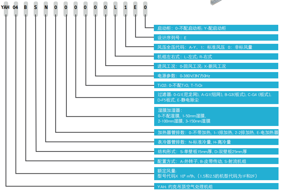 约克YAH系列吊顶式空气处理机组是中央空调末端装置。其功能是对空气进行降温冷却,去湿干燥、加热、等焓加湿、过滤净化以及作为新风机组等。机组将处过的空气通过风管送到一定距离的地方, 特别适用于小型商业办公大楼和工业应用的空调工程。