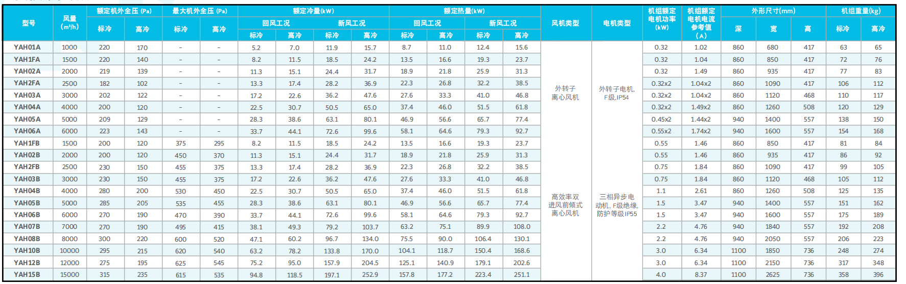 /h。约克YAH01A到06A型号机组采用外转子离心式风机,额定机外全压范围为100-235Pa,约克YAH1FB到15B型号机组采用皮带传动离心式风机,额定机外全压范围为120-315Pa。可提供更多机外全压满足各种需要。