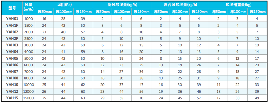 YAH湿膜加湿器性能参数表