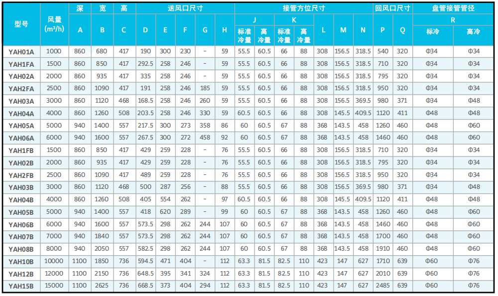 约克YAH系列空气处理机组提供13种型号供客户选择,每种型号均有多种排管方式供选择。冷量从5kW到252kW,风量从1000m3 /h到15000m3