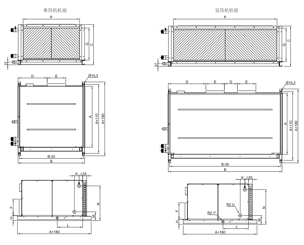 机组的结构形式为镀锌钢板箱内贴保温棉,外挂板式尼龙网过滤器。冷热盘管均采用铜管套双曲波纹片,风机和电机,皮带轮均选用优质产品,性能稳定、高效,风机采用双进风离心前倾多翼风机,外转子电机,防护等级IP54,,F级绝缘。闭式三相异步电机,防护等级IP55,F级绝缘,电源380V/3N~/50Hz,轴承无需润滑。外挂过滤器既可以从侧面取出,也可以从下面取出。
