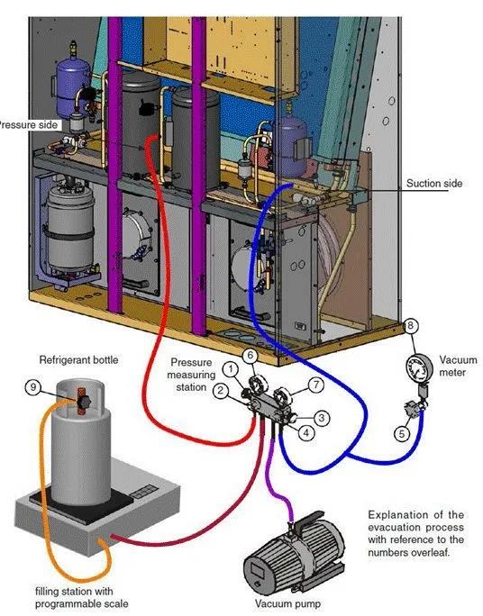 系统抽真空:管路长度15m以内抽1小时,管路长度30m以内抽2小时。二次抽空法,如真空泵真空度达不到50HMG,则应向管道内注入R22气体至平压以上,保持10-15分钟后再次抽真空。管道抽真空后,不得真空状态 长时间放置,应注入至正压以上。