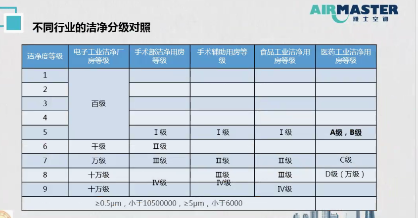 不同行业的洁净分级对照